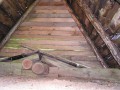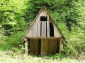 Prvý prístrešok sa nachádza v nadmorskej výške 540 m n.m., 40 minút od Kalinovského sedla. Je to celodrevená stavba, ktorá má lepšie časy už za sebou, no pocestnému ešte môže poslúžiť. Je priamo pri ceste, zasadená do krovia. Strecha je ešte celá a teda nemalo by do nej zatekať. V spodnej časti sa nachádzajú dvere a za nimi sa cez pavučiny dá vojsť do miestnosti asi 2,5 m x 3,5 m. Podlaha je hlinená a bola dosť vlhká. Rozhodne tam treba mať niečo pod spacák. Určite sa tu pohodlne vyspia piati ľudia. Prístrešok nemá okno. V podkroví, do ktorého sa dá dostať aj bez rebríka, je sucho a dá sa tu spať v suchu aj bez karimatky. Len brvná tvoriace podlahu by asi tlačili. S vodou pre blízkosť potoka (je cez cestu), nie je problém. Dreva je dosť v okolitom lese. Chatku asi používali lesníci.