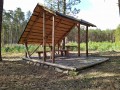 Krytý dřevěný přístřešek s kamennou podlahou.